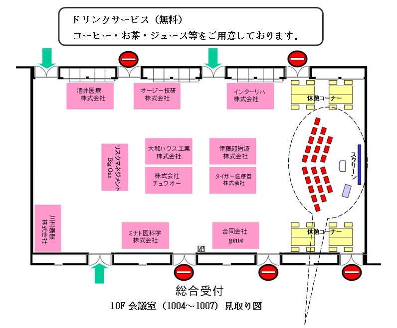 - A10階会議室1004〜1007では、展示企業によるプレゼンテーションコーナーを設けており(破線で囲んだ部分)、リハビリテーション関連機器などの紹介を行っていただきます。同じく10階会議室1004〜1007内には、休憩コーナーを設けております。休憩、情報交換など、ご自由にお使い下さい。