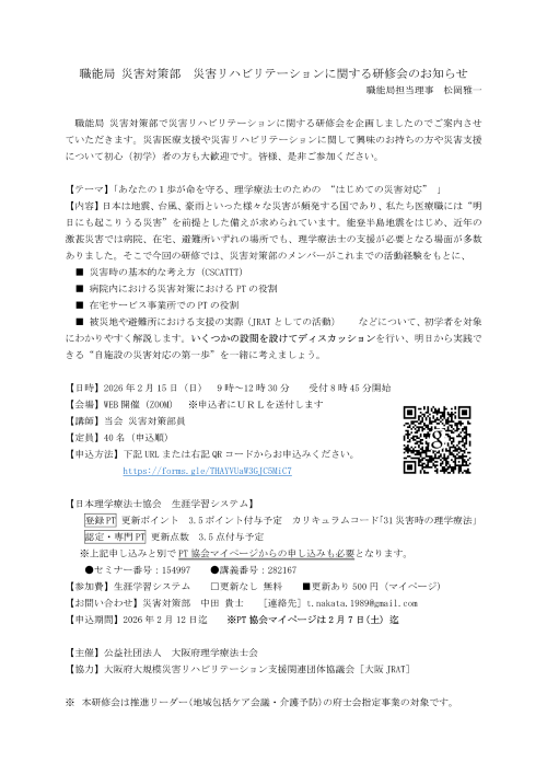 災害対策部 災害リハビリテーションに関する研修会のお知らせです。