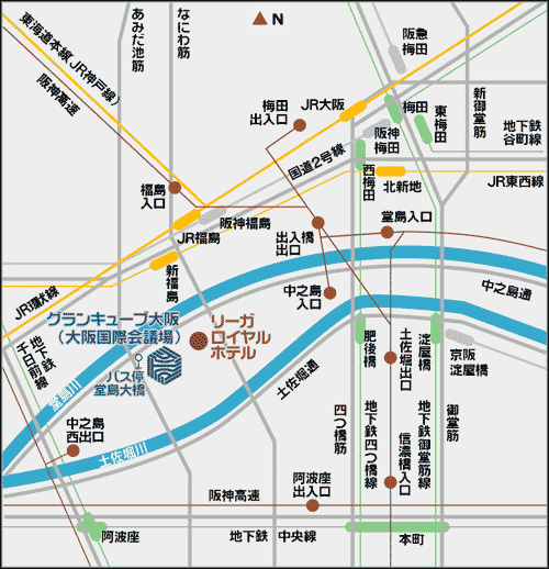 | シャトルバス“ リーガロイヤルバス ”が、「リーガロイヤルホテル」(大会会場の東隣)と 各ターミナル(JR「 大阪 」中央出口、地下鉄・京阪「 淀屋橋 」西詰)の間を運行しており、ご利用いただけます(無料)。 |